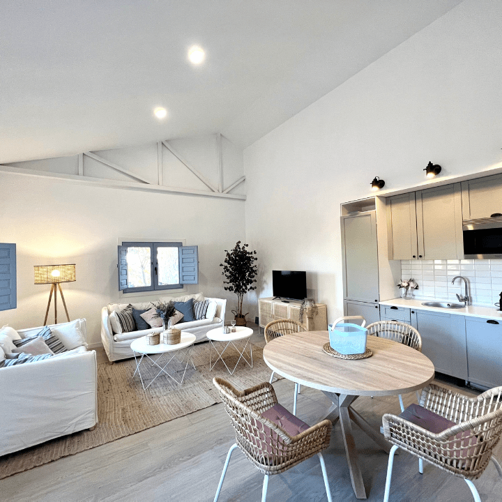 La vivienda es independiente y está totalmente equipada. Consta de salón-comedor con cocina americana, techos altos y chimenea de leña, tres dormitorios con 5 camas, 3 dobles y 2 individuales, y dos baños con ducha. Acceso directo a patio rústico y zonas comunes compartidas, piscina y jardines de 5.000 m2.